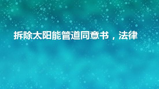拆除太阳能管道同意书是确保拆除顺利进行并保障法律权益的关键。拆除太阳能管道同意书的签署可以防止未经许可进行拆除、损坏或者非法占用管道导致的法律纠纷,同时为每个参与者规定任务分工与责任范围,明确各方之间的权利和义务。拆除太阳能管道同意书建议包括以下内容: