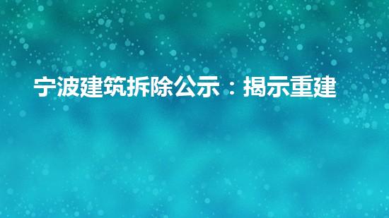 宁波市政府发布了建筑拆除公示,旨在加快城市的重建和更新,让城市焕然一新。本文以拆除行业专家的角度,从四个方面对宁波建筑拆除公示做详细专业深入的阐述,每个方面都会有三个以上的自然段。这四个方面的小标题是:“拆除行业现状与问题”、“拆除技术的进展与应用”、“巴洛仕集团拆除案例分享”和“拆除行业的未来展望”。